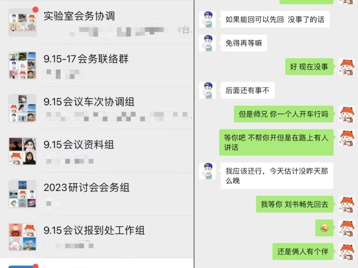 为确保会议的顺利进行,我所40多位学生参与志愿者工作。为了便于工作对接,分别建立了“2023研讨会会务组”、“实验室会务协调”、“9.15-17会务联络群”、“9.15会议车次协调组”、“9.15会议资料组”及“9.15会议报到处工作组”等6个微信群,并在现场配置对讲机,随时对会务工作进行沟通协调。会场布置过程中,部分同学工作到凌晨,每天只睡4-5个小时,从酒店开车返程到学校的过程甚至略有“哈欠”。为了各同学安全,会务组成员相互沟通扶持,互相提醒。