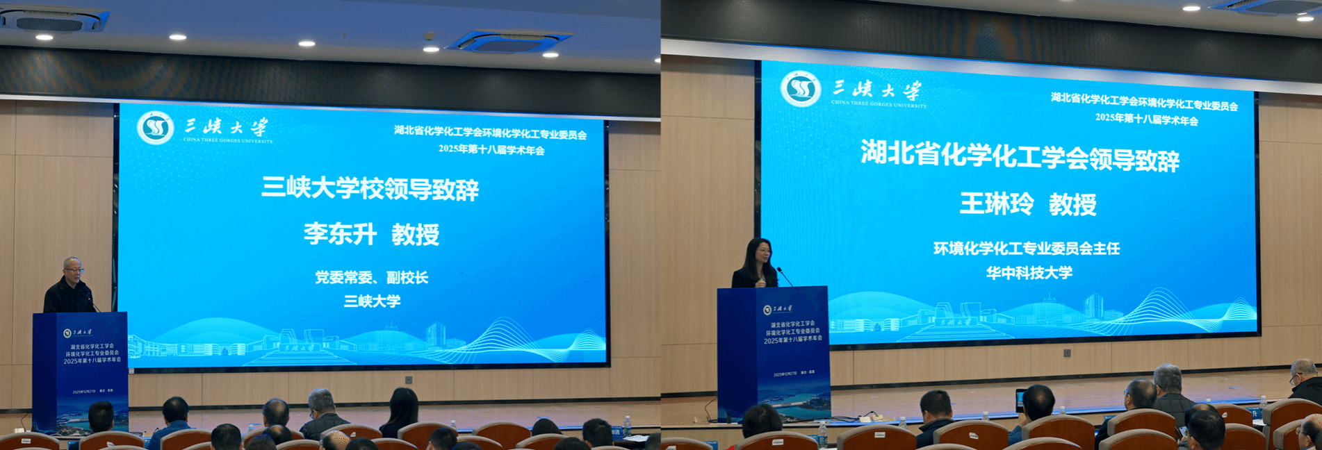 大会开幕式由三峡大学黄应平教授主持。三峡大学党委常委、副校长李东升教授首先代表三峡大学和湖北省化学化工学会讲话,介绍了三峡大学在学科建设与科研创新方面的整体发展,特别强调了学校长期致力于长江生态环境保护与绿色发展的相关科研布局与成果。他进一步指出,本次年会以“绿色低碳、智创未来、交叉融合”为主题,希望通过此次高水平的学术交流,能切实推动环境化学化工领域的产学研深度融合与创新人才培养。随后,湖北省化学化工学会环境化学化工专业委员会主任王琳玲教授致辞。她回顾并肯定了专委会在引领学科发展、促进学术交流方面取得的显著成绩,分析了当前“双碳”目标下环境化学化工面临的新机遇与新挑战,并寄语本届年会能够充分激发思维碰撞,凝聚共识,共同探索通过智能化与交叉融合手段解决复杂环境问题的新路径,为湖北省乃至全国的绿色低碳发展与生态文明建设贡献智慧与力量。
