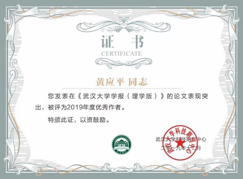 我所黄应平教授发表在《武汉大学学报(理学版)》的论文表现突出,得到武汉大学科技期刊中心的高度肯定,荣获2019年度优秀作者荣誉称号。