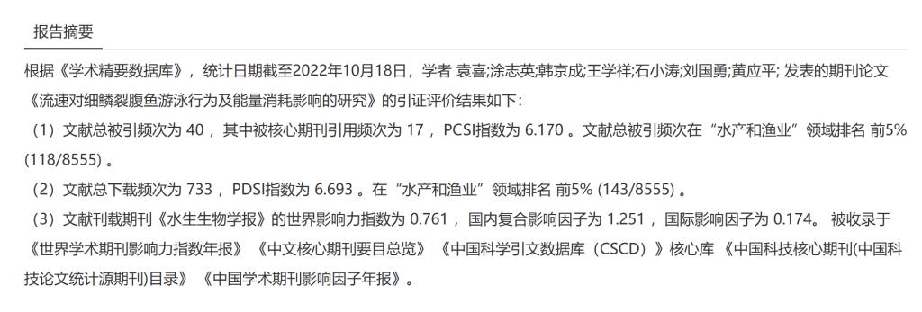 本课题组在《水生生物学报》发表的文章“流速对细鳞裂腹鱼游泳行为及能量消耗影响的研究”成功入选了中国知网学术精要(2022年10-11月)高被引论文。