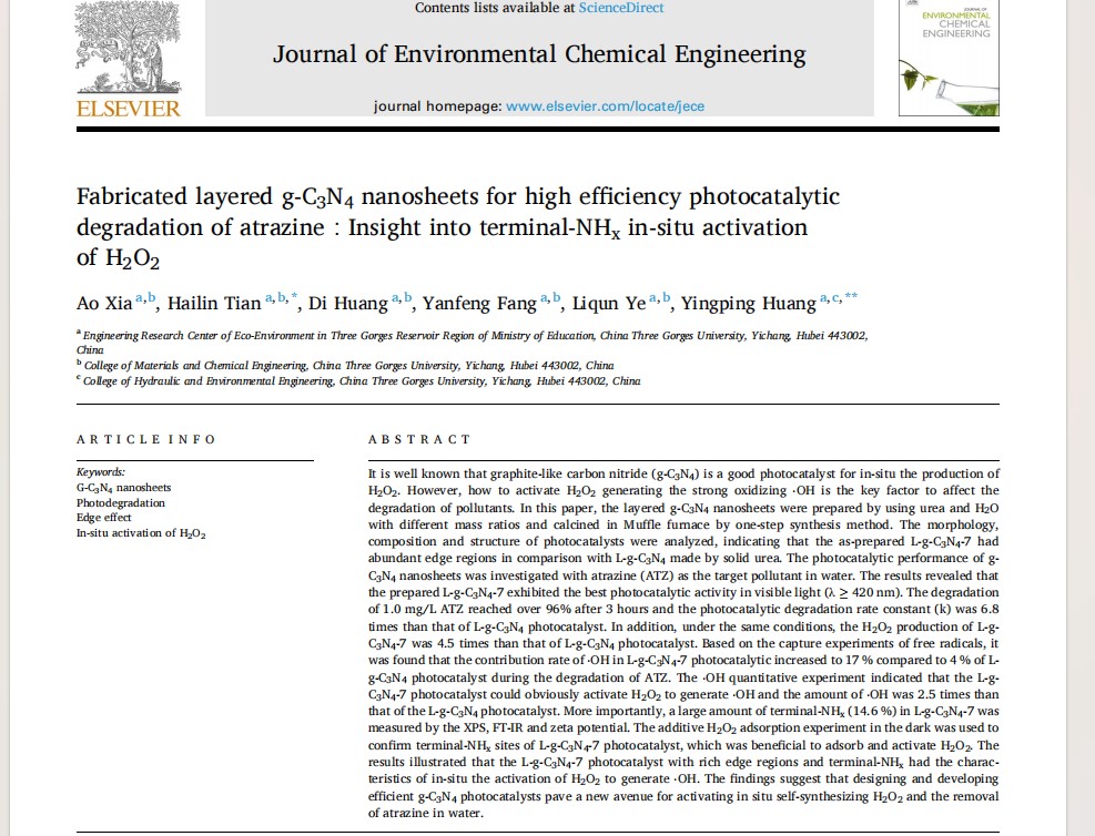 (通讯员 张梦霏)2024年4月26日我所夏澳硕士在Journal of Environmental Chemical Engineering上发表了题为“Fabricated layered g-C3N4 nanosheets for high efficiency photocatalytic degradation of atrazine:Insight into terminal-NHx in-situ activation of H2O2”的研究成果,标志着我所在设计和开发丰富边缘区域和末端-NHx的层状g-C3N4原位活化自供H2O2和有效去除水中阿特拉津领域取得了新的进展。Journal of Environmental Chemical Engineering是中科院二区TOP期刊,专注于环境应用纳米材料,最新影响因子为7.7。本篇论文夏澳为第一作者,田海林副教授和黄应平教授为通讯作者。