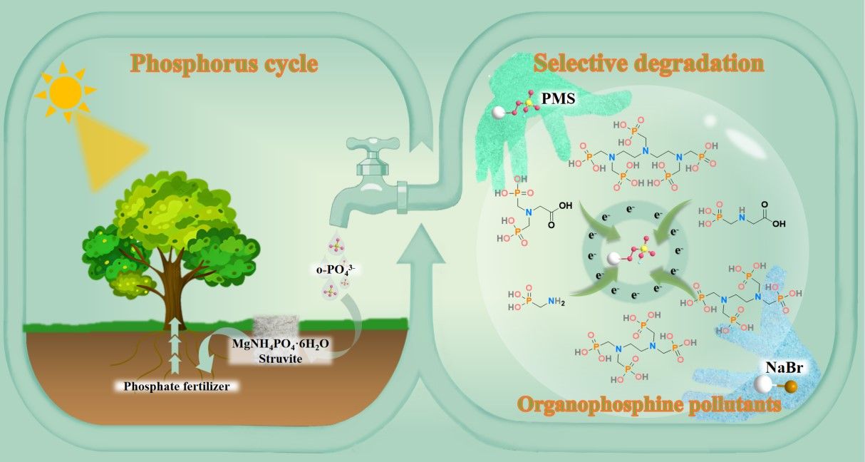 本研究提出含氮膦酸盐的选择性降解是通过触发含氮膦酸盐和PMS之间的电子转移过程来激活的,并由溴活性物种(HBrO)实现。含氮膦酸盐在PMS/Br-体系中的降解速率与膦酸盐的某些特定物理化学性质密切相关。对于真实草甘膦废水,PMS/Br-体系表现出优异的催化活性,化学需氧量降低67.8%,总有机碳减少48.8%,90分钟内形成350μmol/L的o-PO43-,进一步转化为鸟粪石磷肥的产率为84.9%。本研究不仅展示了一种经济、高效的废水脱磷方法,还为从废水中回收磷资源并将其转化为有价值的磷肥产品提供了一种简单经济的途径。