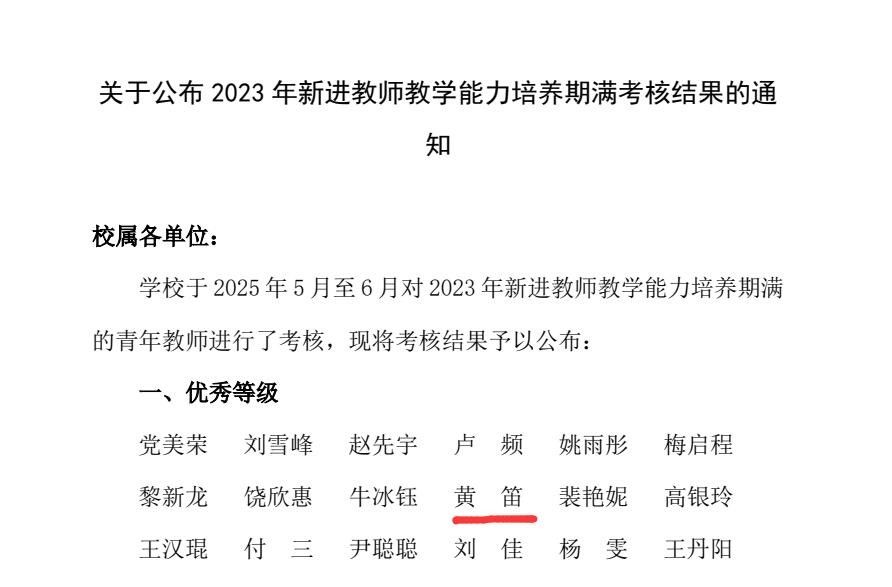 (通讯员 蒋立奥)2025年6月12日,三峡大学教师教学发展中心公布了2023 年新进教师教学能力培养期满考核结果,我所黄笛副教授获得优秀等级。