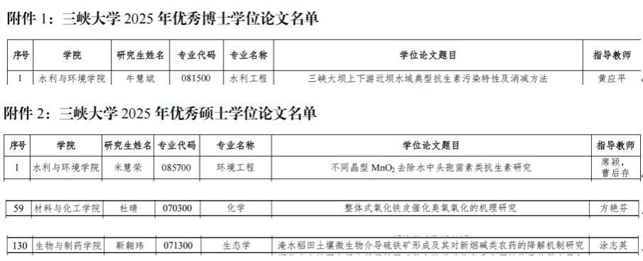 (通讯员 陈淼)2025年7月25日,经个人申报,各学位评定分委员会审核推荐、三峡大学学位评定委员会第67次会议审定,我所博士研究生牛慧斌撰写的《三峡大坝上下游近坝水域典型抗生素污染特性及消减方法》、硕士研究生米慧荣撰写的《不同晶型MnO2去除水中头孢菌素类抗生素研究》、硕士研究生杜晴撰写的《整体式氧化铁皮催化臭氧氧化的机理研究》和硕士研究生靳翱玮撰写的《淹水稻田土壤微生物介导硫铁矿形成及其对新烟碱类农药的降解机制研究》被评为三峡大学优秀毕业论文。