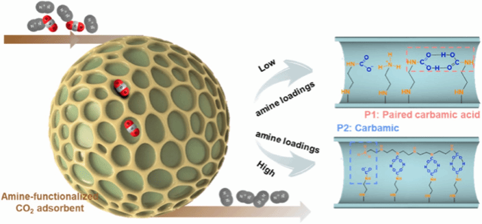 二氧化碳过量排放引发的全球气候变化是人类社会面临的重大挑战,胺功能化固体CO2吸附剂是极具潜力的下一代碳捕集材料,而当前对其性能评价往往仅聚焦于吸附容量,对吸附动力学、胺效率等实用指标关注不足,同时其构效关系与吸附机制也尚未明确。本研究以不同孔结构介孔二氧化硅为载体,负载三种常见有机胺制备了系列吸附剂,建立了涵盖CO2吸附容量、动力学和胺效率的三维评价体系,发现胺负载量与吸附容量呈火山型趋势,对应最大吸附容量的胺负载量并非综合性能最优的条件,综合性能最优的吸附剂胺负载量约占载体孔体积的40%~50%。同时结合多种表征手段与测试方法,揭示了低胺负载下主要生成氨基甲酸酯、高胺负载下易形成氨基甲酸二聚体并阻碍传质的吸附机制;该最优吸附剂经5次循环吸附后,吸附容量仅下降3.18%,表现出优异的循环稳定性。该研究明确了胺功能化硅基吸附剂结构-性能构效关系及其吸附机制,为兼顾吸附容量、动力学和胺效率的固体胺CO2吸附剂设计制备提供了具体的理论参考和实践思路。