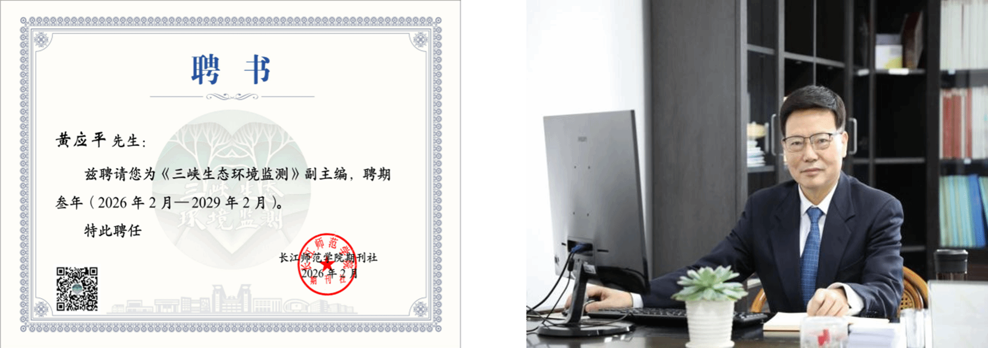 (通讯人:陈娴)22026年2月1日,我所黄应平教授受聘担任《三峡生态环境监测》期刊副主编,聘期自2026年2月起至2029年2月,任期三年。《三峡生态环境监测》期刊是聚焦三峡库区及长江流域生态环境问题的专业学术平台,长期致力于报道生态环境监测领域的前沿动态、关键技术及实践成果。此次聘请黄应平教授出任副主编,是期刊加强编委队伍建设、提升办刊质量的重要举措。