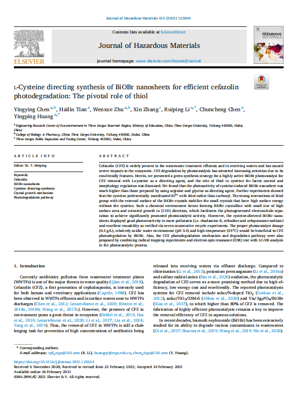 L-Cysteine directing synthesis of BiOBr nanosheets for efficient cefazolin photodegradation: The pivotal role of thiol
